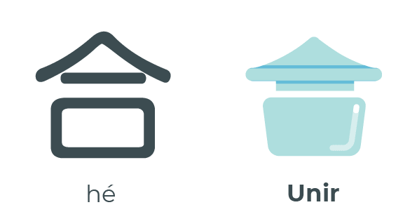 Este bonito carácter que representa un cuenco con su tapa, significa en chino unir, cerrar o encajar, justo lo que se hace con estas dos piezas para mantener el arroz caliente. Se trata de un pictograma, uno de esos poquitos caracteres en chino que simbolizan visualmente lo que representan. Te será por tanto muy fácil reconocerlo y memorizarlo. Cuando te lo encuentres formando parte de alguna palabra piensa siempre en la acción de cerrar, unir o combinar, en dos cosas separadas pero que de alguna manera se pertenecen o encajan. Por ejemplo, si lo combinamos con 适 shì obtenemos 适合 shìhé que significa encajar o sentar bien (como una prenda o un corte de pelo). Otro ejemplo sería 合同 hétóng que quiere decir contrato, el documento que refleja que dos partes se unen mediante un compromiso.