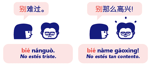 También puedes utilizar bié 别 con adjetivos que describen estados de ánimo como triste, feliz, enfadado, nervioso, etc. (Te recordamos una vez más que el verbo estar no se debe usar delante de un adjetivo):
