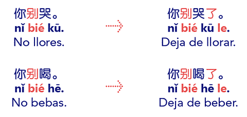 Pero bié 别 no sólo sirve para decir que algo no se haga, sino también para que se deje de hacer (si ya se estaba haciendo). Para ello basta con añadir le 了 al final de la frase. Como la partícula le 了 implica un cambio de estado, la frase tendría entonces el sentido de “ya no …”, “deja de …“ o “para de…“