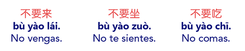 Un detalle. Aunque aquí lo escribamos como bù yào 不要 (dos cuartos tonos) en realidad se pronuncia bú yào 不要 (segundo + cuarto tono) ya que bù 不 cambia a bú 不 cuando va seguido de un cuarto tono. En este curso mostramos los tonos reales de cada carácter de forma aislada pero ten presente que estos pueden variar según las normas del sandhi tonal. Puedes leer más sobre estas excepciones en el uso de los tonos aquí.