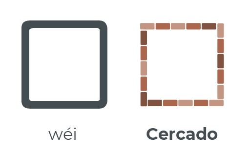 Si hay un carácter fácil, claro y con un significado manifiestamente obvio en chino este es sin duda el radical 囗 wéi. ¿Qué otro símbolo podrías usar si no para expresar “cercar” o “encerrar”? Pues exactamente este mismo, un cuadrado que asemeja el cercado donde tradicionalmente se guardaba el ganado. Y antes que lo preguntes, sí, tienes razón, es clavadito a 口 kǒu (boca). La única diferencia es que 囗 wéi se usa sólo y exclusivamente para envolver y encerrar otros caracteres, para confinarlos en su interior. Por esta razón suele ser también algo mayor. NOTA: Este carácter sólo funciona formando parte de otros, nunca de manera independiente.