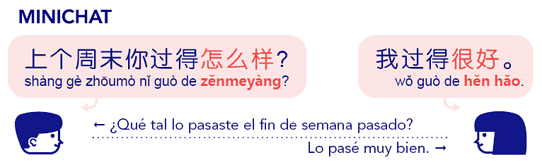 Y ya, para finalizar, si lo que queremos es preguntar cómo alguien hace (o hizo) algo usaremos zěnmeyàng 怎么样 que significa ¿qué tal? Estudia atentamente el siguiente mini diálogo: