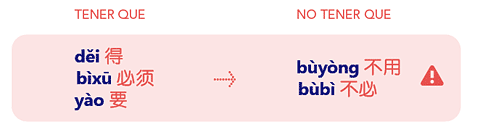 ¡Atención que viene riesgo de patinazo! La forma negativa de estos verbos no es la que dicta la lógica. Para expresar que no existe obligación, es decir, no deber, no tener que o no ser necesario se utiliza buyòng 不用 o bùbì 不必.