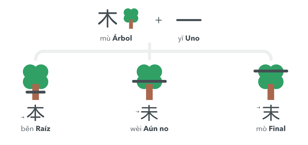 Como ya hemos visto, existen en chino varios caracteres que se forman al combinar los radicales 木 (árbol) y 一 (uno). Vamos a repasarlos para ver las diferencias entre ellos porque a simple vista, sobre todo si el tamaño de la escritura es pequeño, no es fácil distinguirlos. Observa en la imagen superior cómo la posición de la línea 一 va cambiando de lugar según el significado del carácter; en el caso de 本 běn (raíz, origen) se sitúa en la base y aparece un poco más corto, en el caso de 未 wèi (aún no) aparece en el medio y en el caso de 末 mò (final) arriba del todo, en la copa.