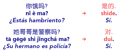 Tan importante como saber preguntar es saber responder. Para responder SÍ en chino basta con repetir el verbo con el que se pregunta, como si fuera un eco. (por ejemplo: ¿Entiendes? ↦ Entiendo). Si la pregunta fuera en pasado, el verbo deberá ir seguido de le 了 (o guò 过). Observa las siguientes oraciones: