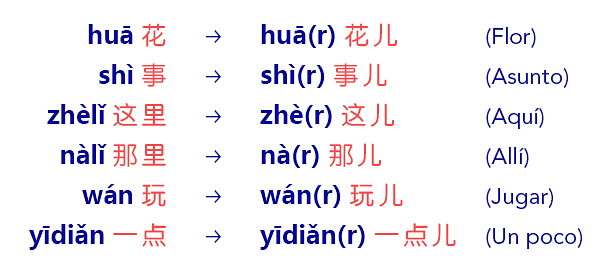En el habla cotidiana de Beijing y otras zonas del norte de China, existe la costumbre de añadir er 儿 al final de algunas palabras. Se trata sólo de una costumbre que, en la mayoría de los casos, no afecta al significado de la palabra, así que usarla o no queda a tu elección. Puedes elegir la forma que te guste más, la que te resulte más fácil o alternarlas según donde te encuentres.