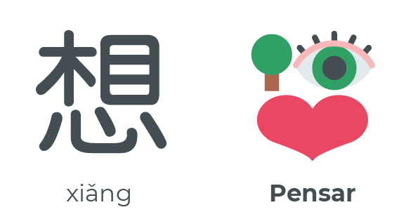 El verbo 想 xiǎng tiene varios significados, todo ellos muy prácticos y útiles, lo que lo convierte en un carácter muy importante y de alta frecuencia de uso. Por un lado significa “pensar” pero también significa “querer” e incluso “echar de menos” (que no es más que otra manera de “pensar” en alguien o algo que “quieres”). Está formado por estos tres sencillos radicales que ya conocemos. Obsérvalos muy atentamente y prestando atención a sus posiciones. Recuerda también que el radical corazón (abajo) incluye siempre una referencia a los sentimientos o los pensamientos.